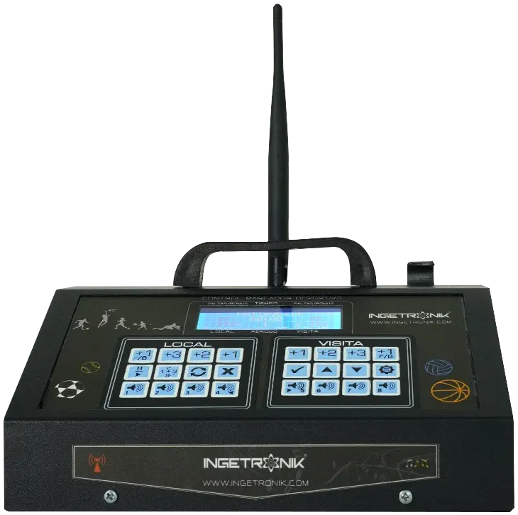 La consola inalámbrica le permite configurar y manipular el marcador deportivo a distancia. Posee una interfaz simple e intuitiva, le permitirá manipular el marcador con facilidad. Su pantalla LCD le permitirá observar las mismas informaciones presentadas en el marcador, en caso de que no tenga visibilidad sobre él.