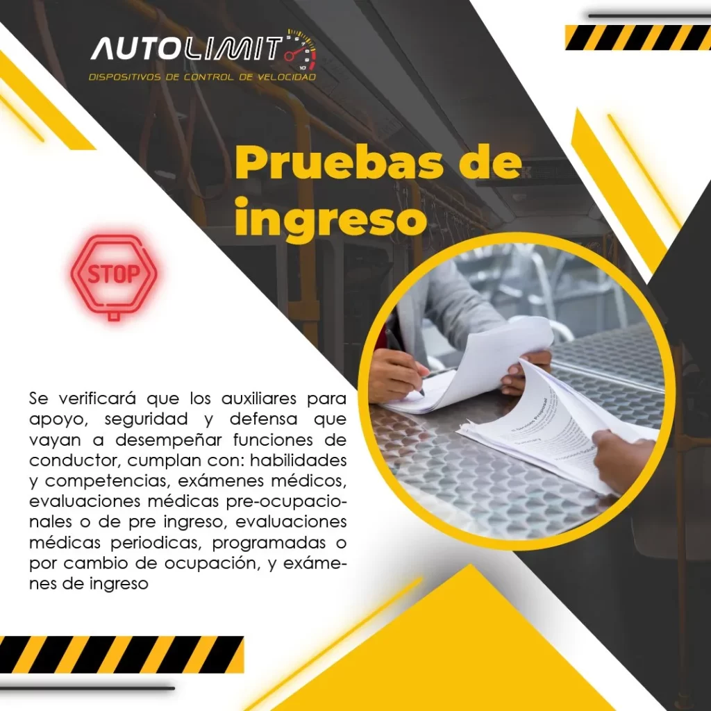 Una de las principales concierne el de las pruebas de ingreso a conductores, donde se verifica que aquellas personas que ejerzan la función de conductor “cumplan con un mínimo de habilidades y competencias, con el objeto de asegurar la idoneidad para la labor asignada.”![]()
